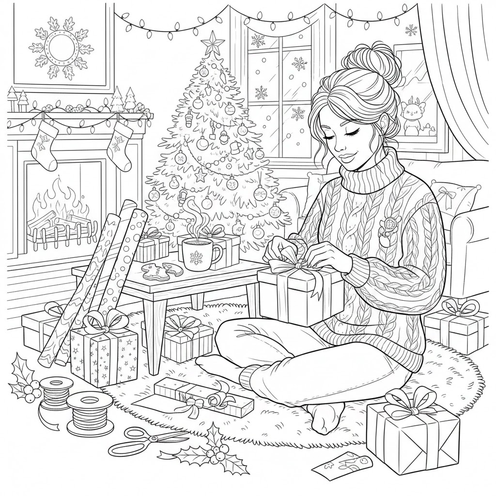 There is a specific kind of magic that happens in the days leading up to the holidays. It isn’t found in the frantic rush of a crowded mall or the stress of a deadline; it’s found in the quiet moments at home. The image provided—a beautiful, line-art illustration of a woman wrapping gifts by a crackling fire—perfectly encapsulates the “Slow Holiday” movement.