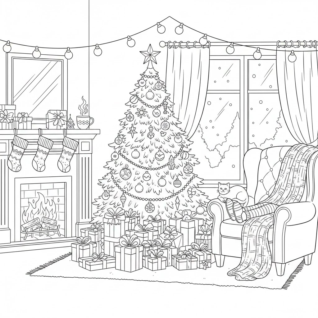 Interestingly, this image is a coloring page. Coloring has transitioned from a childhood pastime to a mainstream adult wellness tool. The intricate lines of the sweater and the delicate ornaments on the tree offer a “low-stakes” creative outlet. It allows the brain to switch off the logical, problem-solving side and engage the creative, rhythmic side.