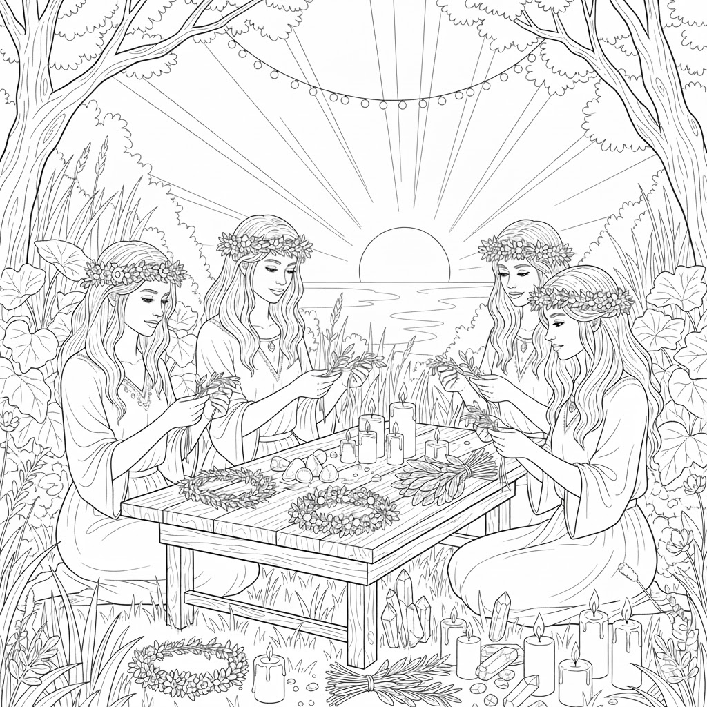 The Summer Solstice is a bittersweet moment. It is the height of the light, but it also marks the moment the days begin to shorten again. This teaches us the vital lesson of presence. The women in the illustration aren’t worried about the coming winter; they are fully immersed in the scent of the herbs, the warmth of the sun, and the company of one another. By engaging in these rituals—whether it’s coloring this very image, weaving a crown, or simply sitting in the grass—we remind ourselves that we are a part of nature, not separate from it.